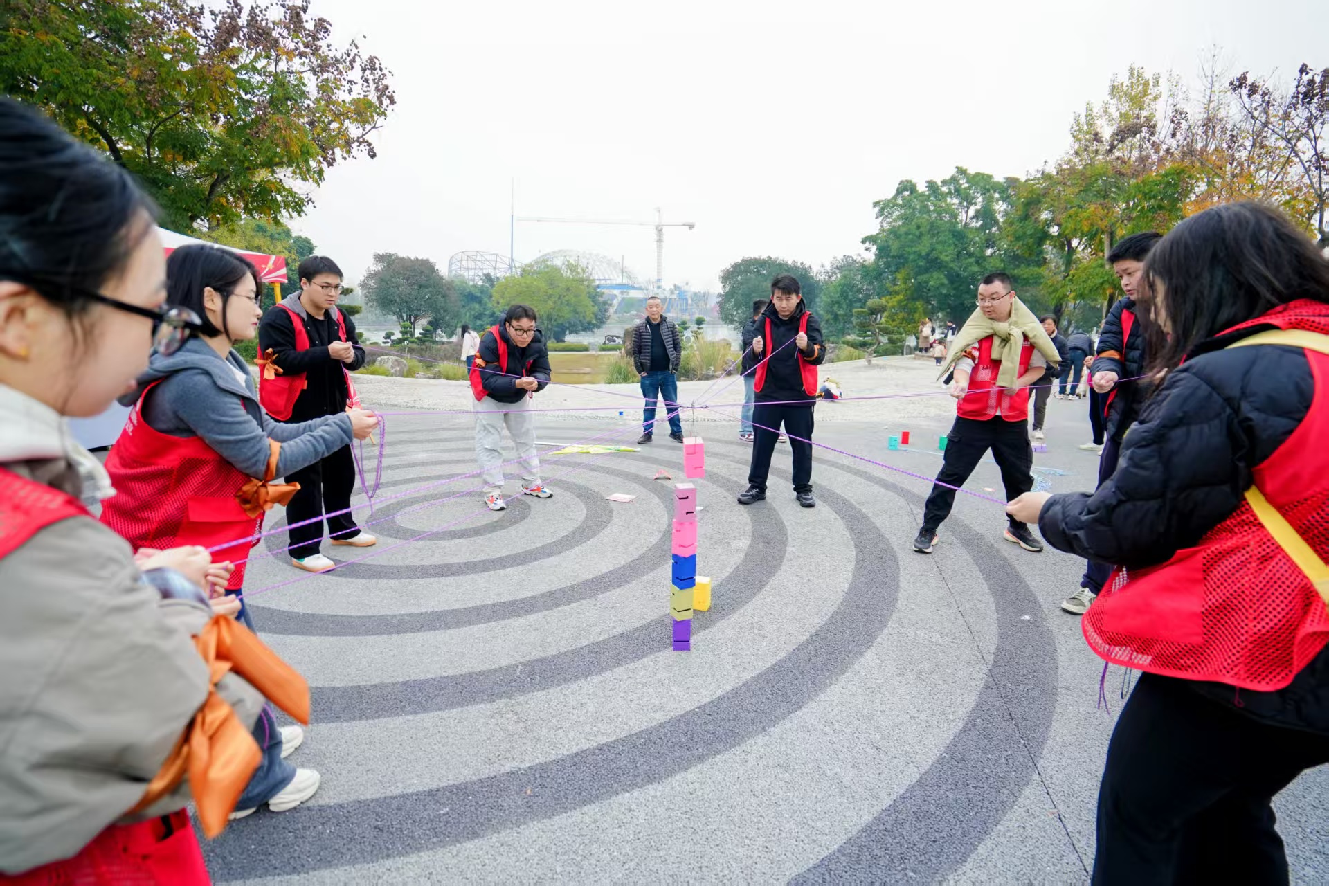 “加油—加油—”在合力筑塔挑战点位,伴随着阵阵喝彩声,每个小分队上场队员呈对角线站立,通过操纵手中红色连线,将场中央堆放的一块块彩色积木吊起,垂直叠放在塔基上,最终以规定时间内形成的塔形高度计分。该项挑战需要每个队员精准控制力度,细心观察积木位置移动,主要是考验参与者互相配合协作能力,吸引了众多游客驻足围观。
